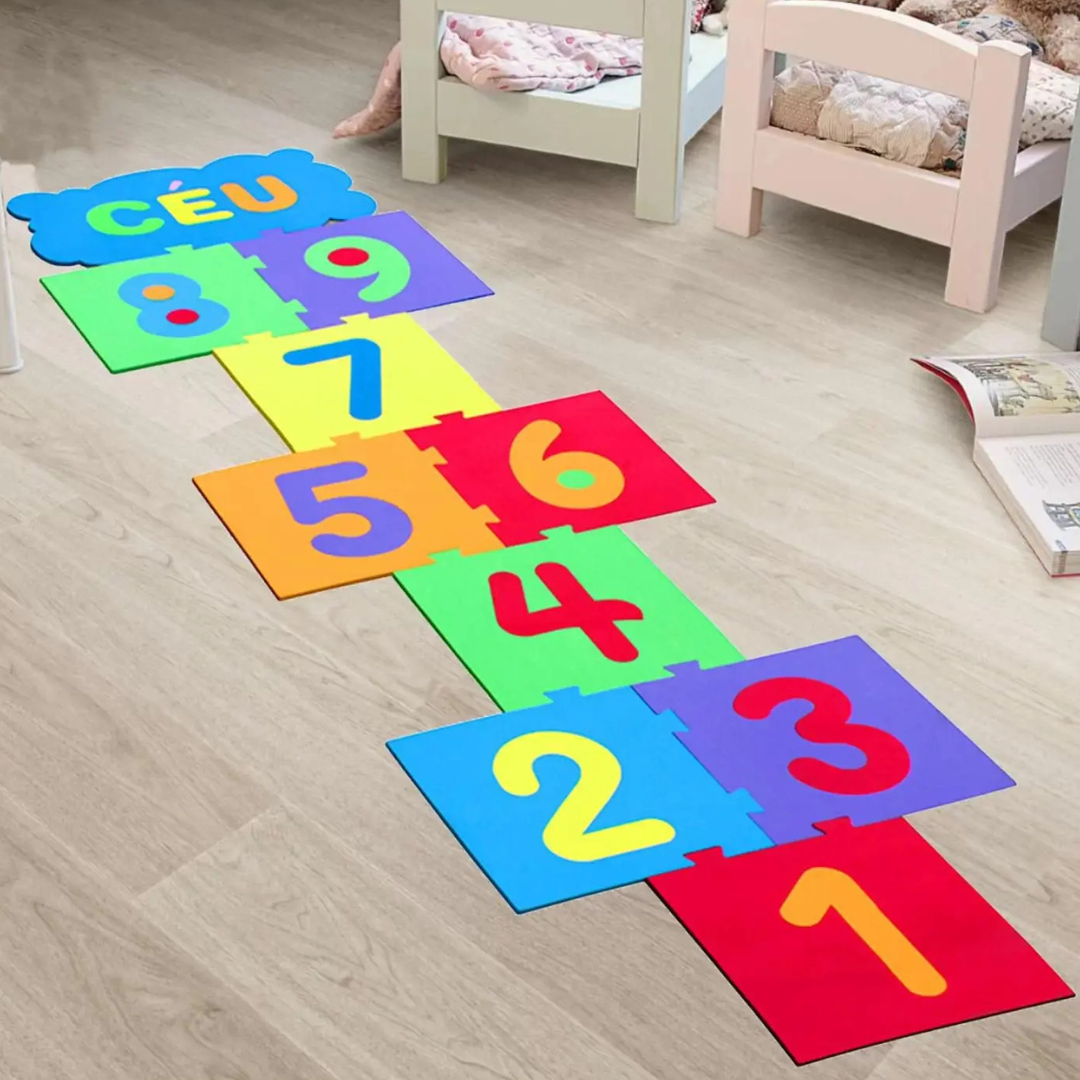 O conjunto serve para formar o jogo da amarelinha, como ainda montar casinhas ou formar tapetes.