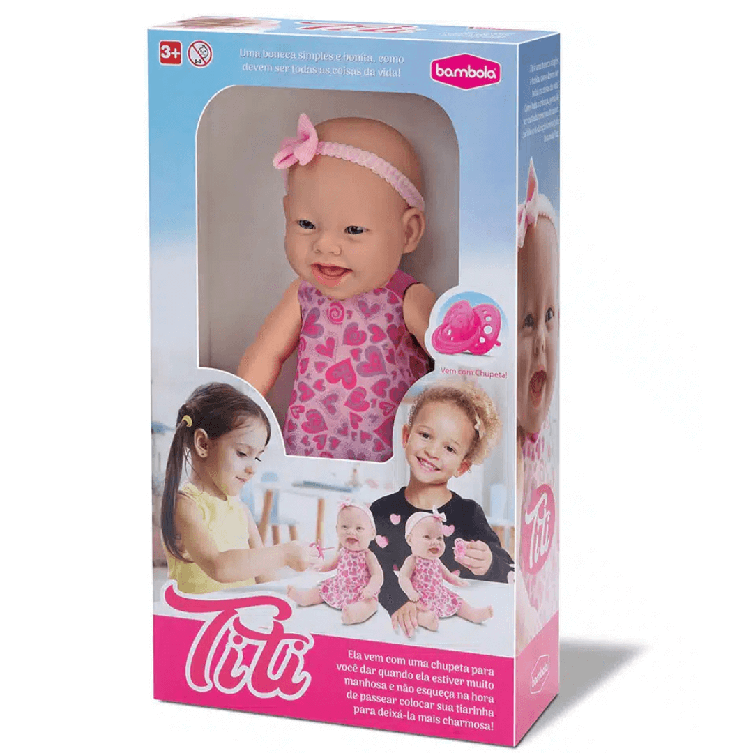 Possui corpo,mebros de plástico, cabeça de vinil, olhos fixo e um lindo vestidinho.