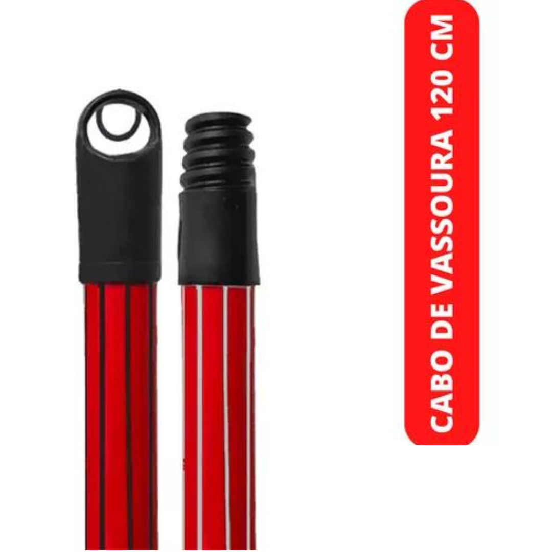 Este produto é um cabo de vassoura de alta qualidade, com uma capa listrada e ponta plástica. Foi projetado para um uso confortável e resistente, com uma ponta de tamanho padrão que se adapta à maioria das vassouras.