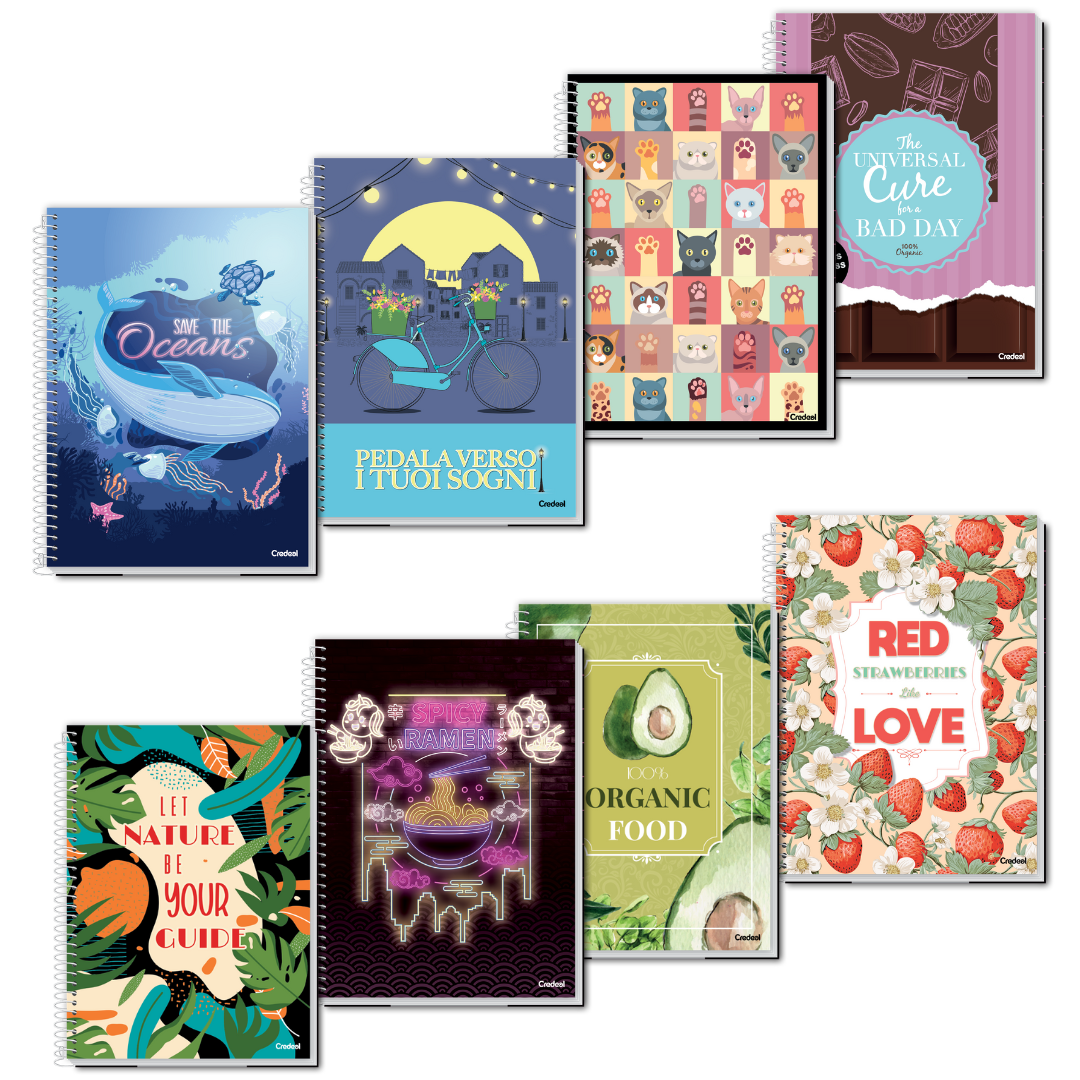 Possui capa dura, folhas pautadas, folha de adesivos e espiral colorido.