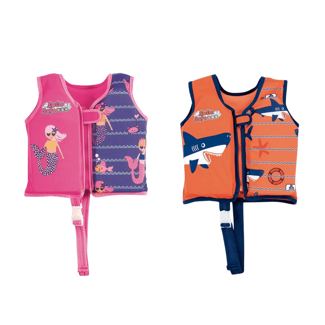 Perfeito para proteger os pequenos durante o verão, esse colete está disponível nas cores laranja com azul marinho, com estampa de tubarão, e rosa com lilás, com estampa de sereia.
