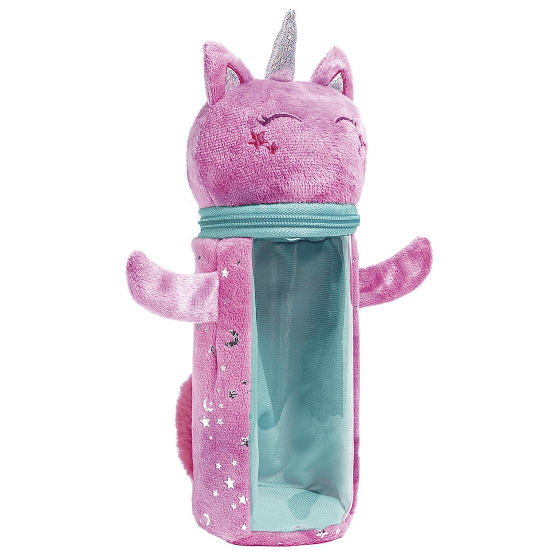 Esse modelo encantador apresenta estrutura fofinha de unicórnio em corpo tubular, com um visor transparente para facilitar a visualização dos itens, forro interno e detalhes em 3D.