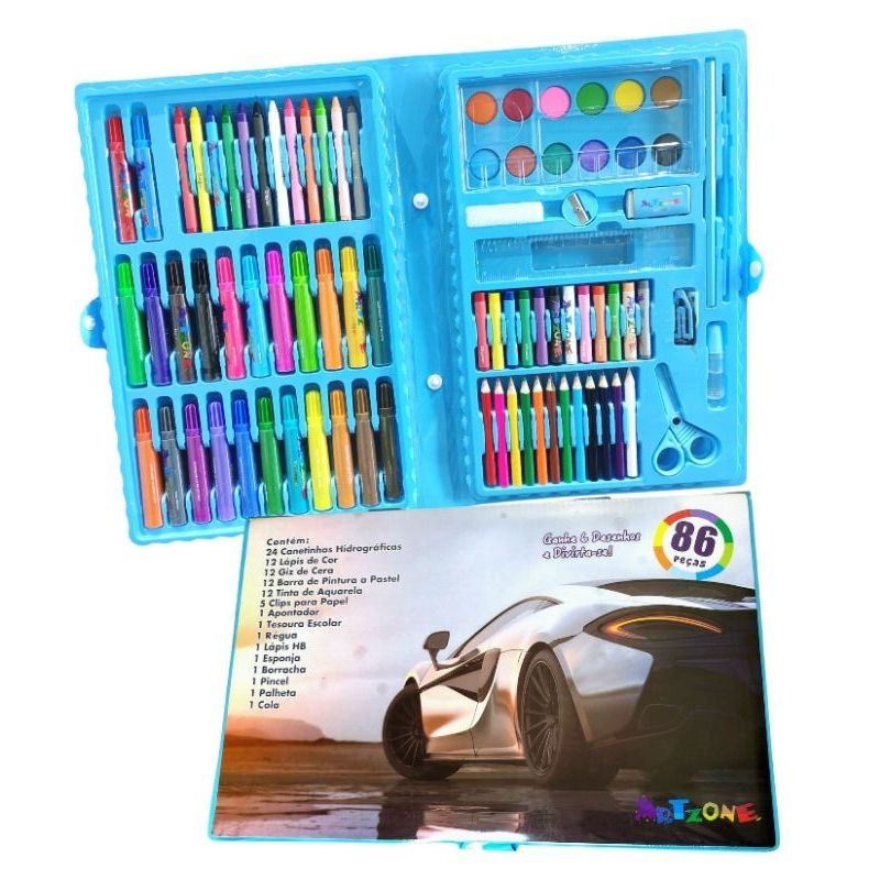 Conteúdo da embalagem: 24 Canetinhas hdrográfica, 12 lápis de cor, 12 giz de cera, 12 barra de ointura a pastel, 12 tintas aquarela, 5 clips para papel, 1 apontador, 1 tesoura escolar,1 régua, 1 lápis HB, 1 esponja,1 borracha,1 pincel, 1palheta e 1 cola.