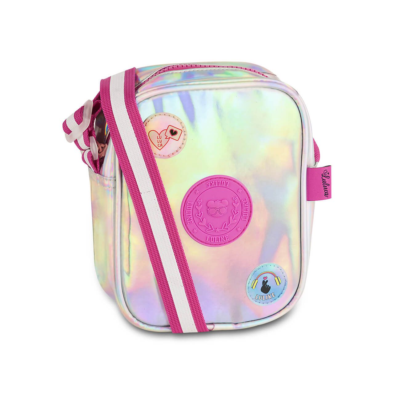 A shoulder bag oficial da Luluca é confeccionada em PVC holográfico com silk, tags e patches no painel frontal.