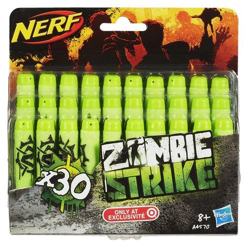Esteja sempre preparado com o refil de 30 dardos com design especial Nerf Zombie.
