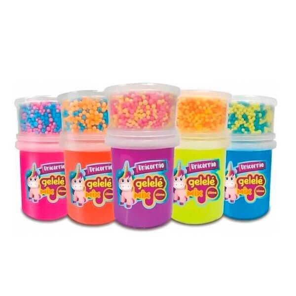 São 6 cores perolizadas de slime: rosa, violeta, azul, amarelo, verde e vermelho flúor, um mix de bolinhas de isopor em duas cores e um acessório surpresa para decorar o slime.